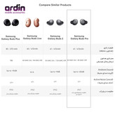 سایر مشخصات : مجهز به تراشه BCM ۴۳۰۱۵ پشتیبانی از Bixby voice wake-up پشتیبانی از کدک های SBC و AAC پشتیبانی از بلوتوث با پروفایل های A۲DP / AVRCP / HFP مجهز به سنسورهای شتاب سنج، Voice Pickup Unit ،IR و Hall دارای سه میکروفون روی هر گوشی قابلیت حذف صدای مزاحم