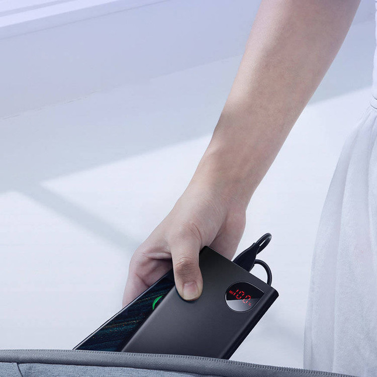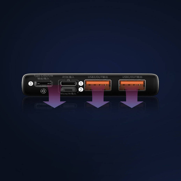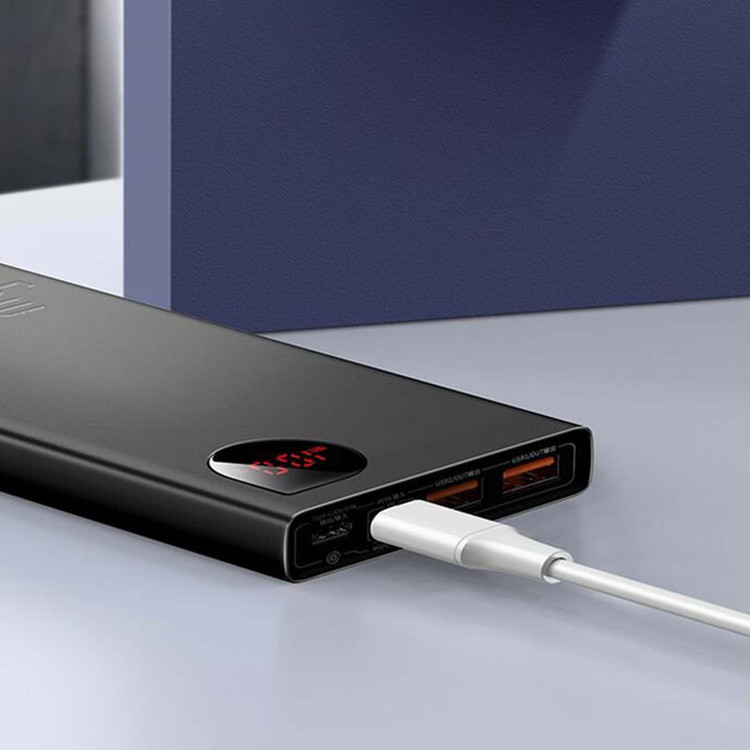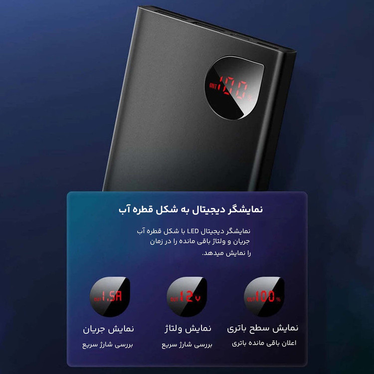 پاوربانک باسئوس Baseus PPAD000001 Adaman Metal Digital Display Quick Charge 5A 2021 Edition PPADM10S دارای سه پورت خروجی است که دوتای آن USB بوده که به شما این امکان را میدهد تا بتوانید دو گوشی را با شدت جریان و ولتاژ 5V-3A شارژ کنید. همچنین این پاوربانک دارای یک پورت تایپ سی است که هم به عنوان یک ورودی و هم خروجی استفاده میشود. این محصول دارای سه پورت ورودی بوده که شامل پورتهای میکرو یو اس بی، لایتنینگ و تایپ سی میباشد و باعث شده تا بتوانید به راحتی با تمامی این کابل ها این پاوربانک را شارژ کنید. ظرفیت اسمی پاوربانک فست شارژ باسئوس Adaman برابر با 10000 میلی آمپر ساعت و ظرفیت واقعی آن 5800 میلی آمپر ساعت است. هر کدام از پورتهایی که گفتیم قادرند توان مشخصی را به شما بدهند. شدت جریان، ولتاژ و توان خروجی هر کدام از پورتهای این پاوربانک عبارت است از: پورت های یو اس بی خروجی: 4.5V/5A (SCP) - 5V/4.5A - 5V/3A - 9V/2A - 12V/1.5A؛ پورت تایپ سی خروجی: 5V/3A - 9V/2.22A - 12V/1.5A؛ پورت یو اس بی 1 + یو اس بی 2: جمعا 5V/3A؛ پورت یو اس بی 1 یا 2 + تایپ سی خروجی: جمعا 5V/3A؛ پورت یو اس بی 1 + یو اس بی 2 + تایپ سی: جمعا 5V/3A؛ پورت تایپ سی ورودی: 5V/3A - 5.5V/3A - 9V/2A؛ پورت میکرو یو اس بی ورودی: 5V/2A - 9V/2A؛ پورت لایتنینگ ورودی: 5V/2A - 9V/2A. این پاوربانک مجهز به یک چیپست هوشمند میباشد که قادر است از باتری گوشی شما در برابر نوسانات و اتصالات کوتاه محافظت کند به گونهای که شدت جریان خروجی از پاوربانک را با شدت جریان ورودی گوشی شما یکسان میکند تا هیچ گونه آسیبی به باتری گوشی شما وارد نشود. پورت های USB این محصول مجهز به فناوری QC 3.0 بوده که از گوشی شما هم دارای این فناوری باشد میتوانید با سرعت بسیار بالا گوشی موبایل خود را شارژ کنید. پورت Type-C هم از فناوری PD برخودار است که به شما امکان شارژ دستگاههایی غیر از گوشی موبایل که در رنج توان این پاوربانک قرار دارند را میدهد. در نگاه اول به این محصول نظر شما به سمت نمایشگر LCD این محصول جلب میشود زیرا طراحی بسیار زیبایی داشته و قادر است میزان شدت جریان، ولتاژ و ظرفیت را به شما نشان دهد. بدنه پاوربانک BASEUS Adaman از پلاستیک ABS و متریال PC بوده که از مقاومت بالایی در برابر خط و خش و ضربه و حرارت دارد.