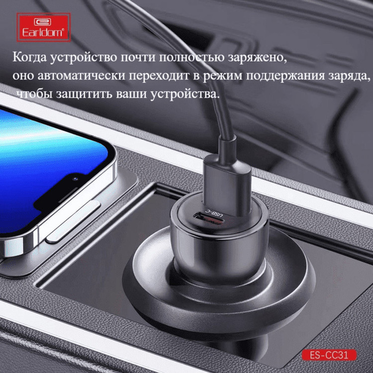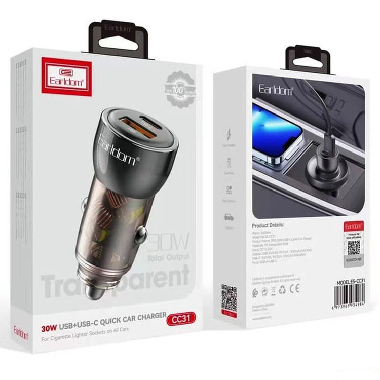 شارژر Earldom ES-CC31 Dual Ports Car Charger با بدنه شفاف و توان خروجی 30 واتی با در نظر گرفتن وجود هر دو پورت یو اس بی تایپ A , C را ارائه مینماید که به راحتی قادر است از طریق درگاه USB Type-C توان لازم جهت شارژ موبایل و تبلت را فراهم نماید. برای شروع شارژ، کافی است شارژر فندکی را به ورودی فندکی خودرو که میتواند 12/24 ولت باشد وصل کنید. تنوع در ولتاژ ورودی خیال شما را از بابت نوع خودرو راحت می کند. شارژر فندکی 30 وات ارلدام مدل cc31 می تواند به طور همزمان باتری دو دستگاه الکترونیکی را شارژ کند. پورت Type-C همانطور که در ادامه نشان داده شده است با توجه به دارا بودن استاندارد PD تا 30 وات توان شارژ را ارائه می دهد و سرعت شارژ سریع تری را نسبت به پورت USB-A با استادارد QC 3.0 و توان 18 وات دارد. وجود 2 درگاه USB باعث شده امکان شارژ 2 گجت به صورت همزمان را دارا باشید.