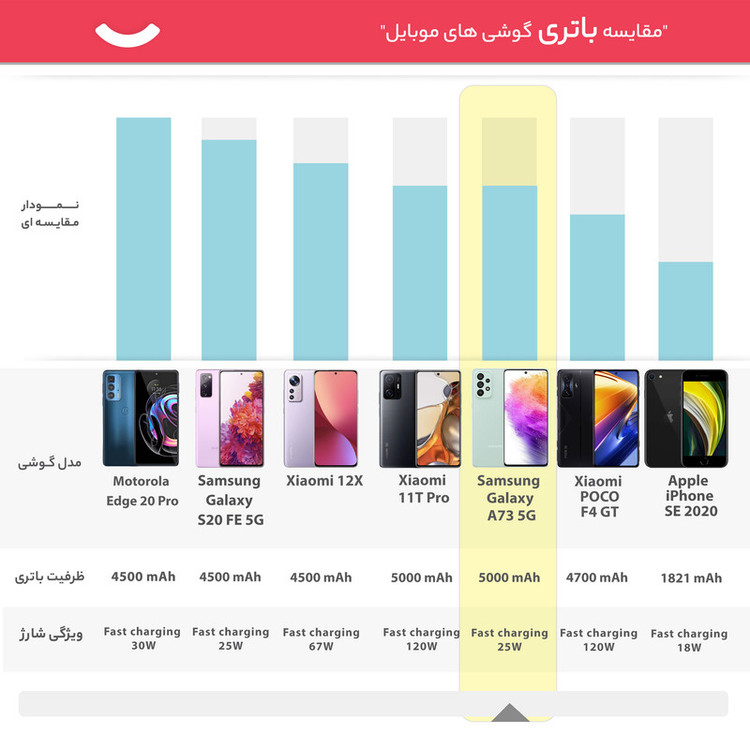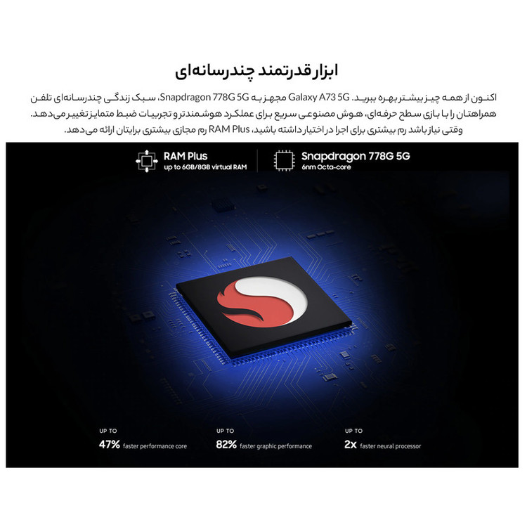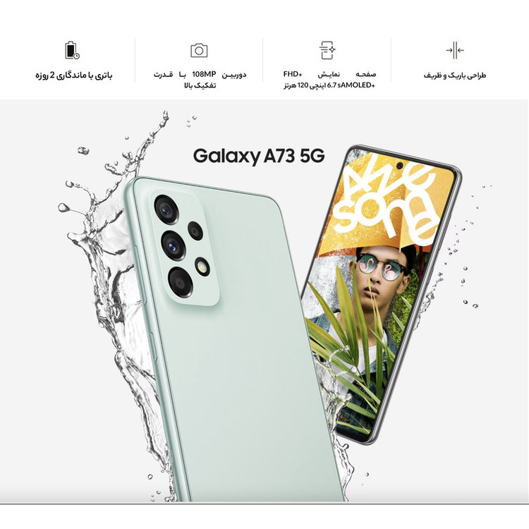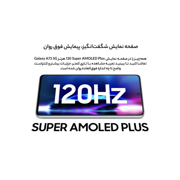 برخی از گوشیهای هوشمند میانرده از مشخصات فنی قدرتمندی بهره بردهاند که در برخی از موارد مشخصات فنی در نظر گرفته شده، چیزی کم از یک پرچمدار ندارند. سامسونگ Galaxy A73 5G SM-A736B/DS هم یکی از این گوشیهای هوشمند میانرده باکیفیت موجود در بازار است که به لطف بهره بردن از مشخصات فنی قدرتمند، توانایی ارائه عملکرد بسیار خوبی را دارد. در نمای روبهرویی این گوشی به صفحهنمایش با ابعاد 6.7 اینچ و رزولوشن 1080×2400 پیکسل از نوع سوپرامولد پلاس مجهز شده است. صفحهنمایشی با توانایی نمایش 393 پیکسل در هر اینچ و نرخ بروزرسانی 120 هرتز. میزان روشنایی 800 نیت (شمع در مترمربع) سبب شده تا در شرایط نوری متنوع، وضوح تصویر بسیار خوبی را از این صفحهنمایش باکیفیت شاهد باشید. سنسور دوربین اصلی قدرتمند با رزولوشن 108 مگاپیگسل از نوع عریض در کنار سنسور 12 مگاپیکسل فوق عریض (ultrawide) و دو سنسور با رزولوشن 5 مگاپیکسل از نوع ماکرو و سنجش عمق، سنسورهای دوربین چهارگانه این گوشی هوشمند میانرده قدرتمند را تشکیل میدهند. بریدگی دایرهای شکل ناچ در قسمت بالایی و مرکزی صفحهنمایش، سنسور دوربین سلفی بسیار مناسب 32 مگاپیکسلی را در خود جای داده است. یکی از قدرتمندترین پردازندههای میانرده شرکت کوالکام، یعنی اسنپدراگون 778G 5G این گوشی هوشمند را همراهی میکند. حضور چنین پردازندهای سبب خواهد شد تا عملکرد بسیار خوبی را در اجرای بازی و برنامههای کاربردی محبوب شاهد باشید. باتری با میزان ظرفیت 5000 میلیآمپرساعت و توانایی پشتیبانی از شارژ سریع با توان 25 وات، از دیگر مشخصات در نظر گرفته شده برای این گوشی هوشمند میانرده هستند. لازم به ذکر است که درون جعبه این گوشی خبری از آداپتور شارژر نیست و باید آن را بهعنوان وسیله جانبی خریداری کنید.