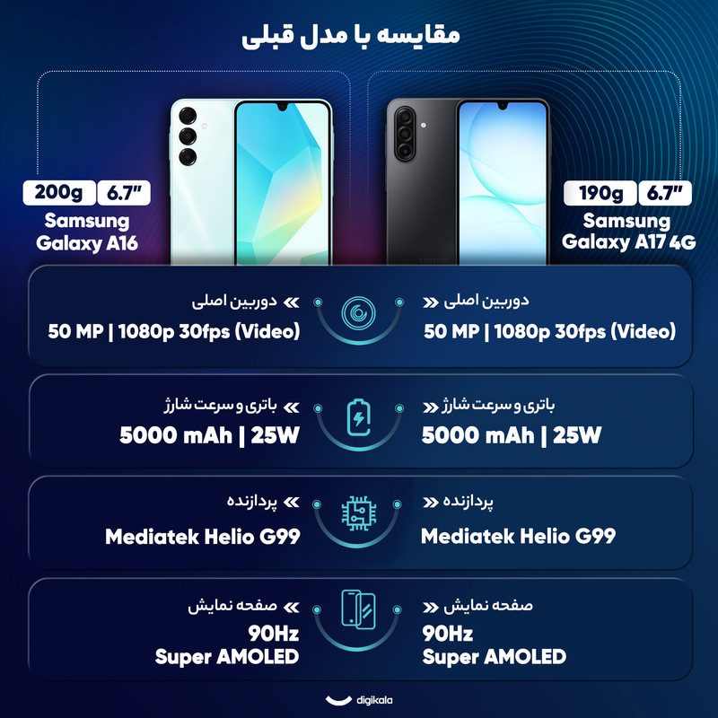 گوشی سامسونگ Galaxy A17 یکی از جدیدترین اعضای خانواده اقتصادی و میانرده سامسونگ است که با ترکیب طراحی ساده، نمایشگر باکیفیت و باتری قدرتمند به بازار آمده تا پاسخگوی نیاز کاربران روزمره باشد. این گوشی با بدنهای خوشدست و وزن متعادل طراحی شده و در عین سادگی، حس مدرن و جوانپسندی دارد. نمایشگر 6.6 اینچی آن از نوع Super AMOLED با رزولوشن +FHD است که رنگها را زنده و شفاف نشان میدهد و تجربهای روان برای تماشای فیلم یا وبگردی فراهم میکند. سامسونگ در این مدل از نرخ نوسازی 90 هرتز استفاده کرده تا اسکرول و جابهجایی بین برنامهها روانتر انجام شود. از نظر پردازشی، Galaxy A17 به تراشهای هشت هستهای Helio G99 مجهز است که برای استفاده روزمره مانند شبکههای اجتماعی، تماسهای ویدیویی و اجرای بازیهای سبک به خوبی عمل میکند. حافظه داخلی و رم متنوع نیز امکان انتخاب بر اساس نیاز کاربر را فراهم میسازد و در صورت نیاز، میتوان از کارت حافظه جانبی هم پشتیبانی میکند. دوربین اصلی سهگانه گوشی با لنز 50 مگاپیکسلی، عکسهایی شفاف و با جزئیات ثبت میکند و دوربین سلفی آن برای تماس تصویری یا ثبت لحظههای شخصی کاملاً مناسب است. باتری 5000 میلیآمپر ساعتی این مدل یکی از نقاط قوت اصلی آن است که با یک بار شارژ میتواند به راحتی یک روز کامل یا حتی بیشتر دوام بیاورد. پشتیبانی از شارژ سریع 25 واتی هم باعث میشود زمان کمتری را صرف شارژ دستگاه کنید. در مجموع، سامسونگ Galaxy A17 گزینهای اقتصادی و کارآمد است که برای کاربرانی که به دنبال گوشی خوشقیمت، باتری پرقدرت و نمایشگر باکیفیت هستند، انتخابی ارزشمند محسوب میشود.